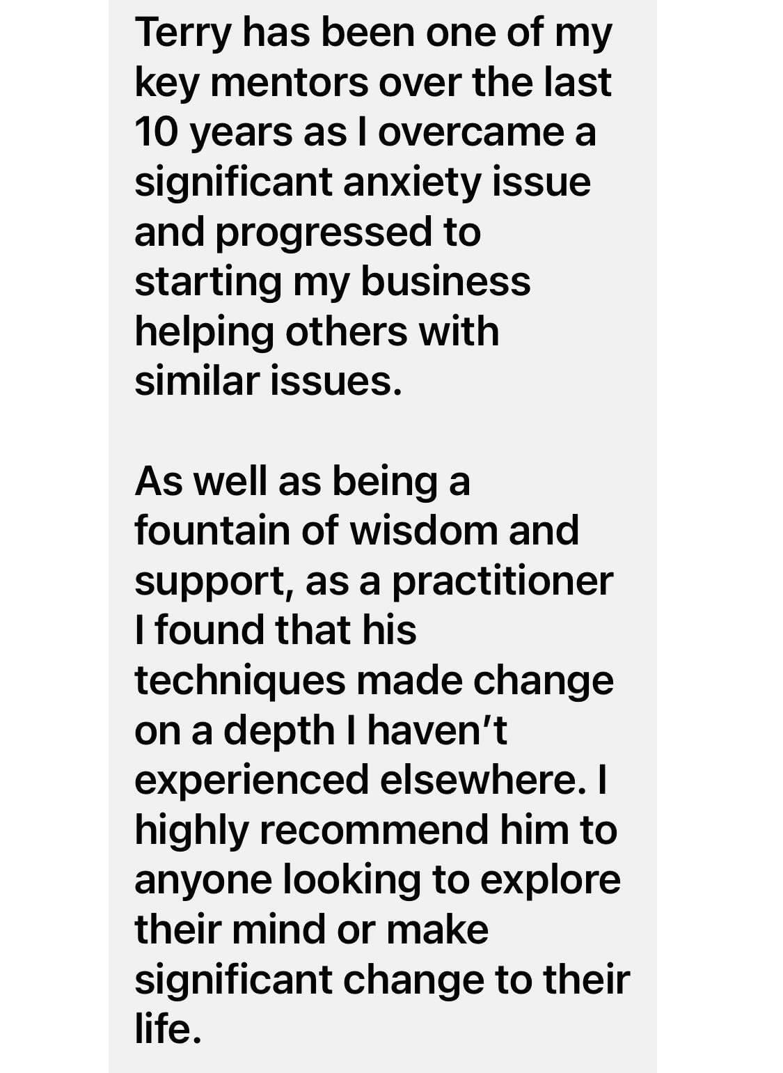 Utilising an ‘Inside Out’ approach, Terry guides people to enter empowering levels of consciousness, find peace of mind (regardless of circumstances), and fine tune their inner mental programming by reframing beliefs about themselves and their world and creating a blueprint for success and happiness in their personal and professional lives.